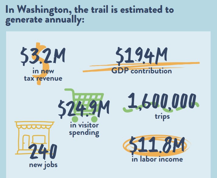 A recent study says the 3,700-mile Great American Rail-Trail, which is more than halfway built, will generate about $25 million in spending and 1.6 million trips within Washington state when completed.
