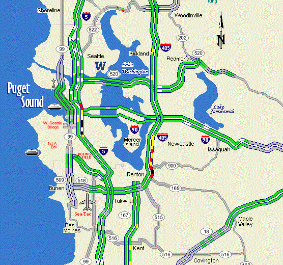A Washington State Department of Transportation map from Tuesday at 8 a.m. showed traffic flowing freely at a time when the routes would normally be filled with red lines.