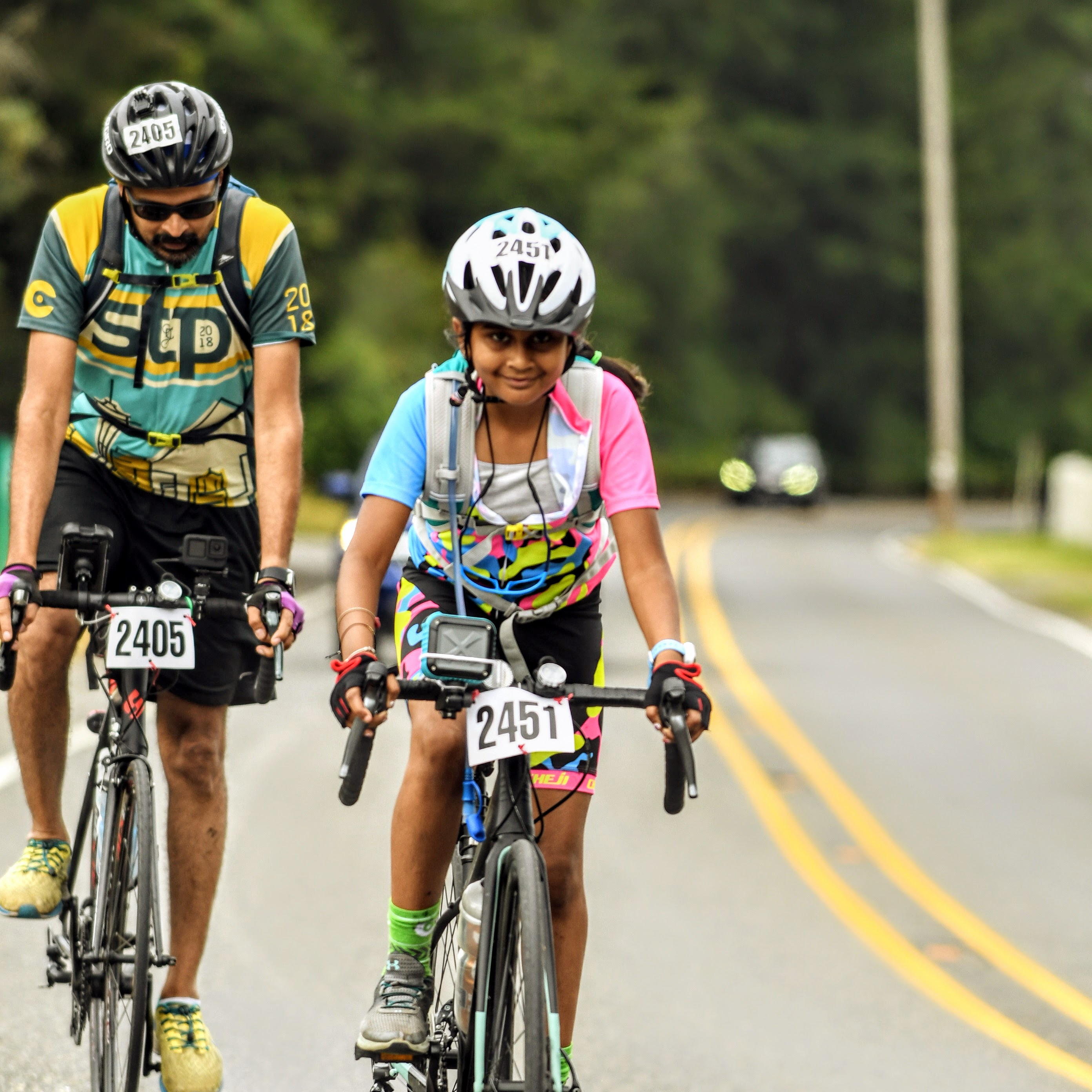 As a parent, however, you must set aside your own fitness goals and be prepared to ride slower than you normally would when training a child. Parthik always rode behind Jaanya at her speed, which means they sometimes finished last on training rides with adults.