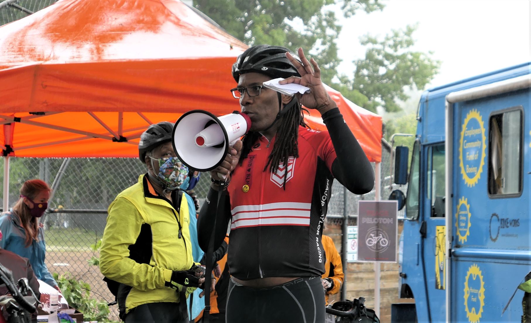 Relying on a growing number of volunteers, Wilson is an active presence at the Peace Peloton rides, wielding a megaphone to organize and inspire the crowd, urging everyone to maintain social distance and wear masks. Participants are encouraged to bring cash to purchase pre-boxed food items from the Black-owned restaurants and stores--providing a direct cash infusion to businesses struggling during the pandemic.