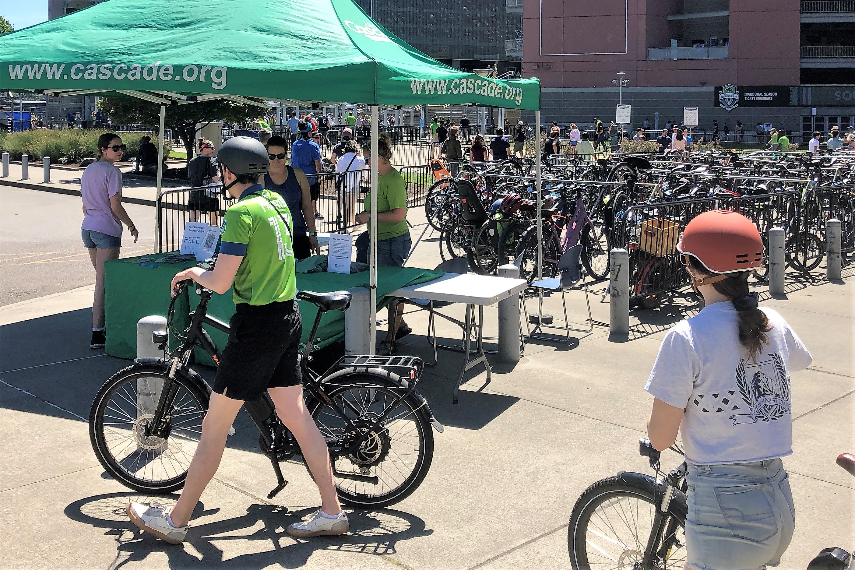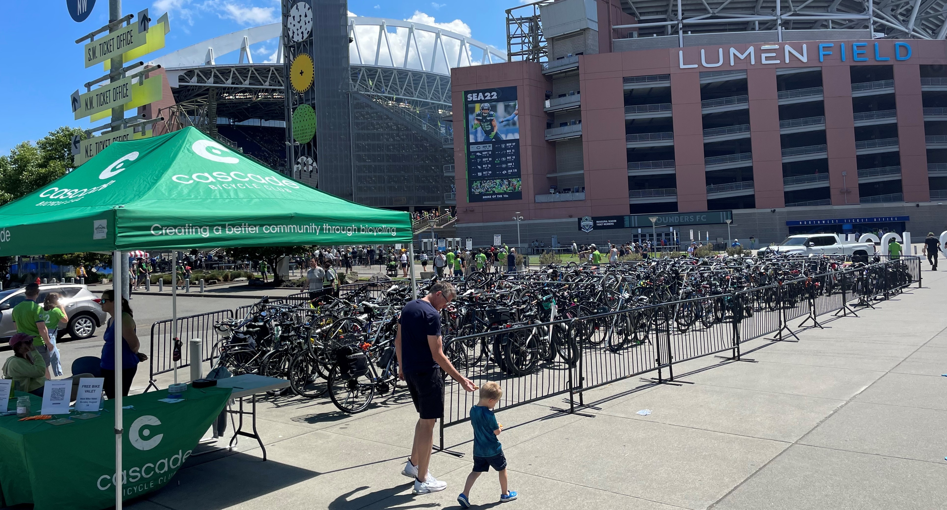 Thanks to a partnership with the Sounders, Cascade Bicycle Club is providing free and secure bike valet services for 10 home games between April and September. Drop off your bike with Cascade staff members at the bike corral on the northwest corner of Lumen Field and we will hold it for you for an hour after the match. On May 31, Cascade also announced it will be providing free and secure bike parking for both the Sounders FC and OL Reign games during the June 3 double header.