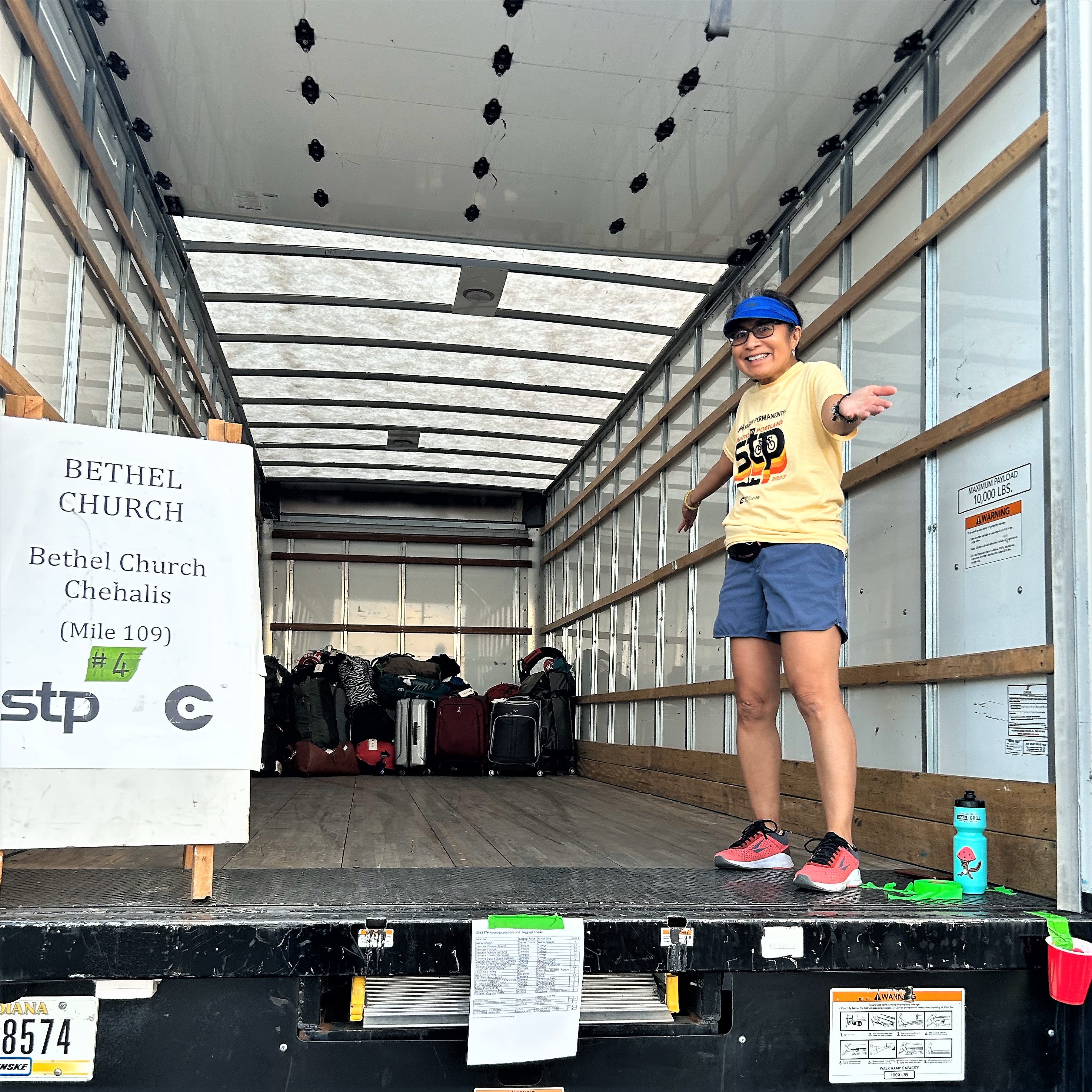 Cascade engages hundreds of volunteers to make STP happen, from Outriders, to medic riders, to volunteers who check bags and staff rest stops. This event could not happen without them and we salute their volunteerism. Below, a baggage truck volunteer helps load bags bound for Chehalis.