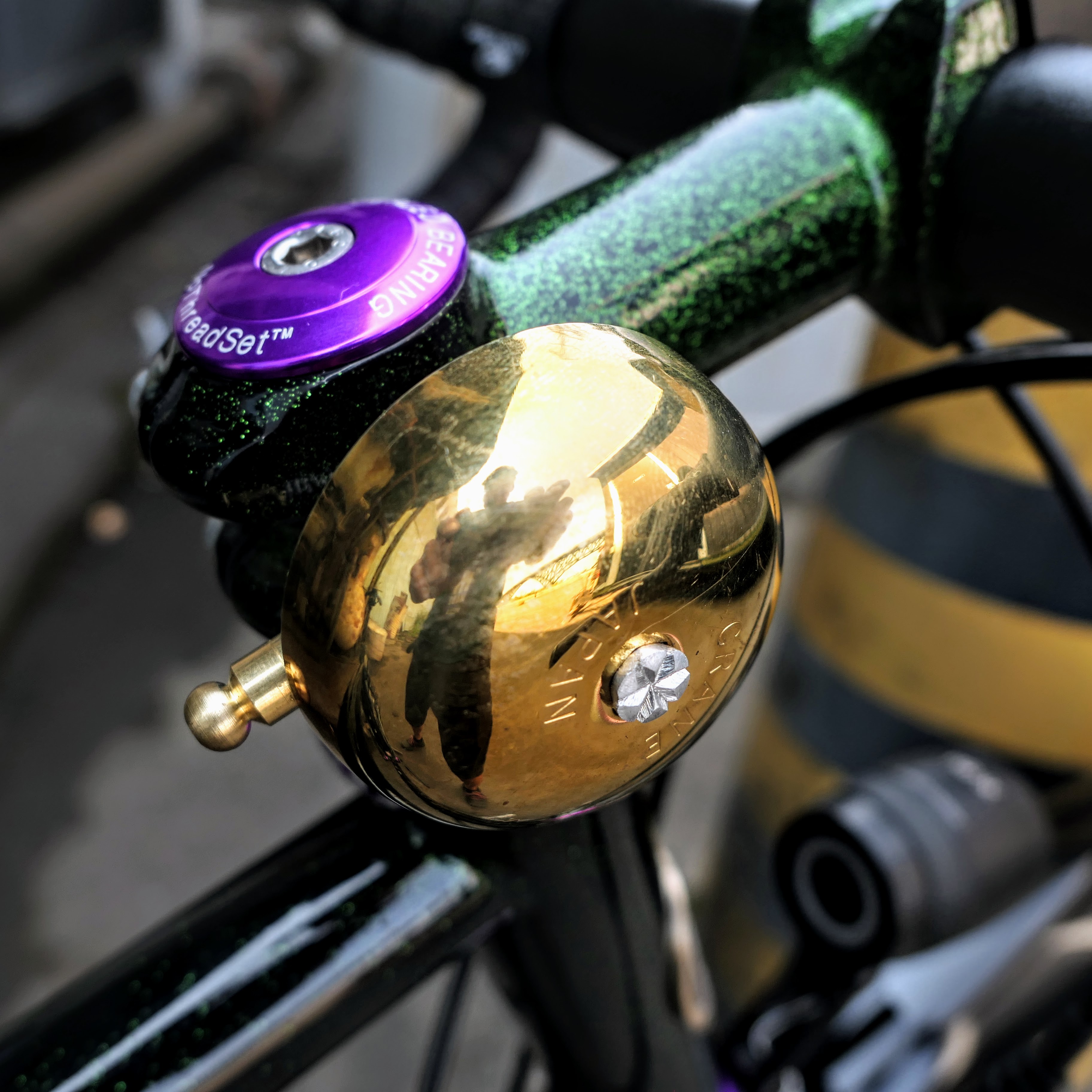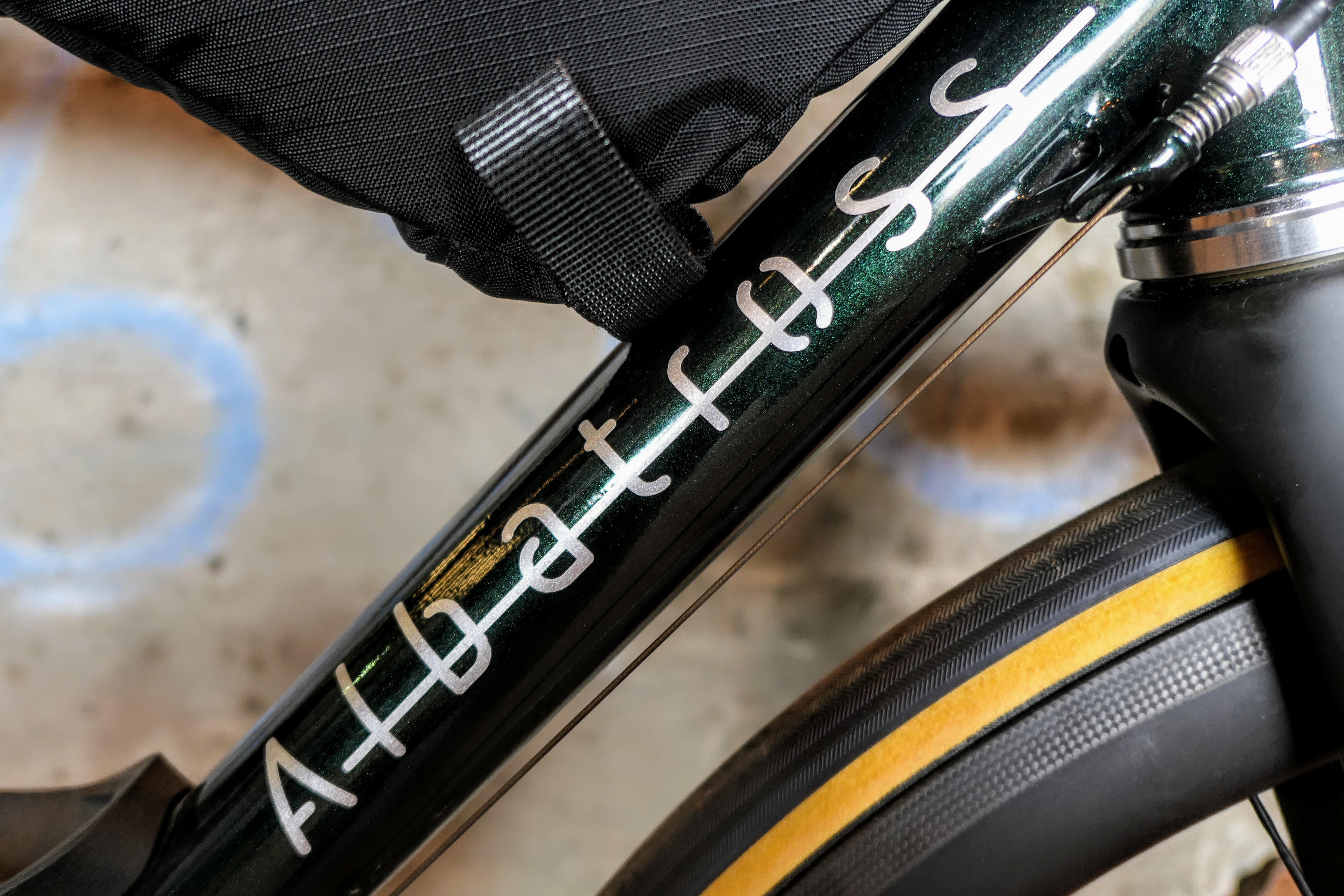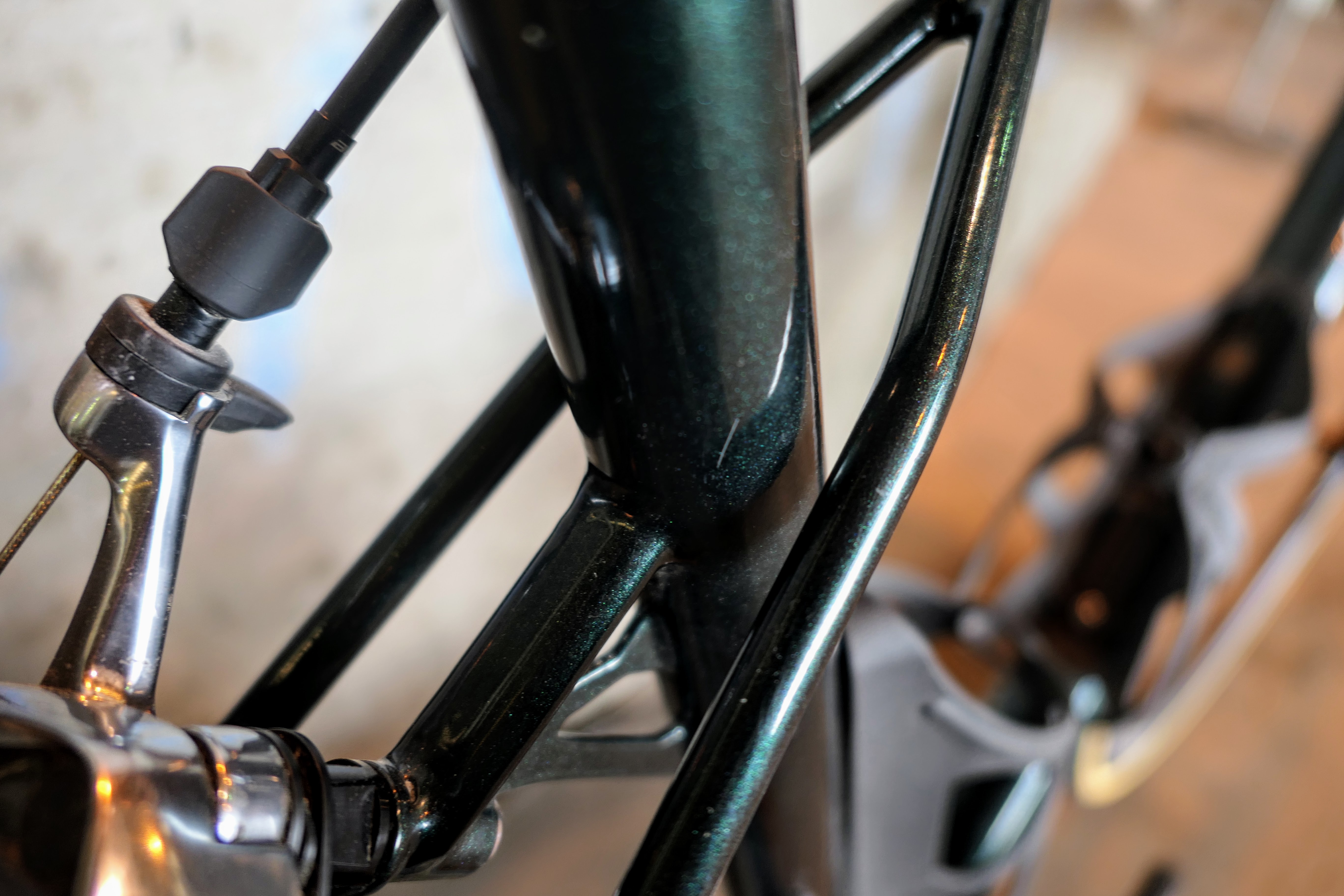 The glitter green finish sparkles in the light. The seat stays extend to the top tube for a nice aesthetic.