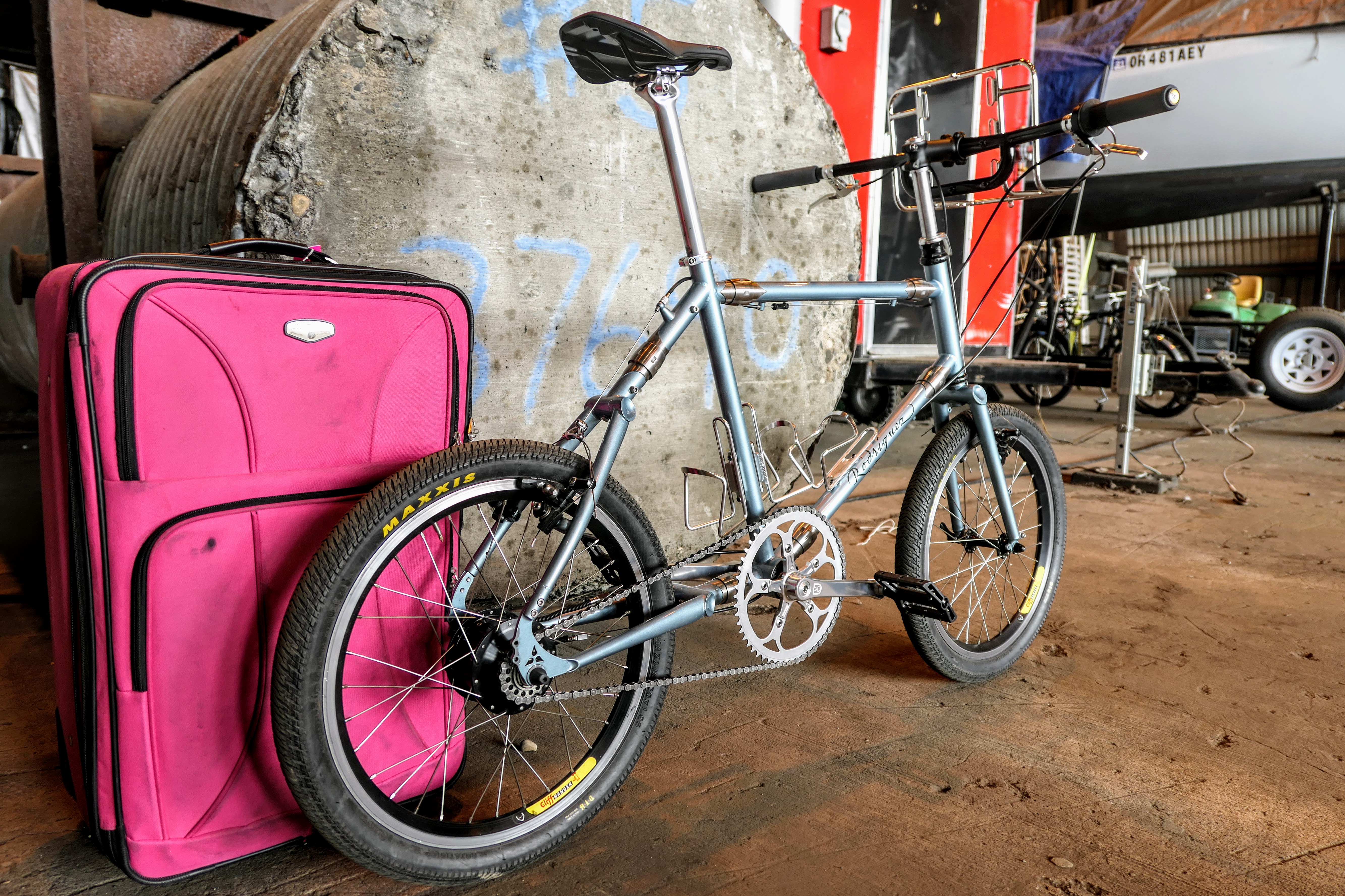 The Rodriguez "Six Pack" travel bike (above) disassembles and fits into that pink suitcase. It has a Rohloff hub instead of a derailleur, 20-inch wheels, and S&S couplers.