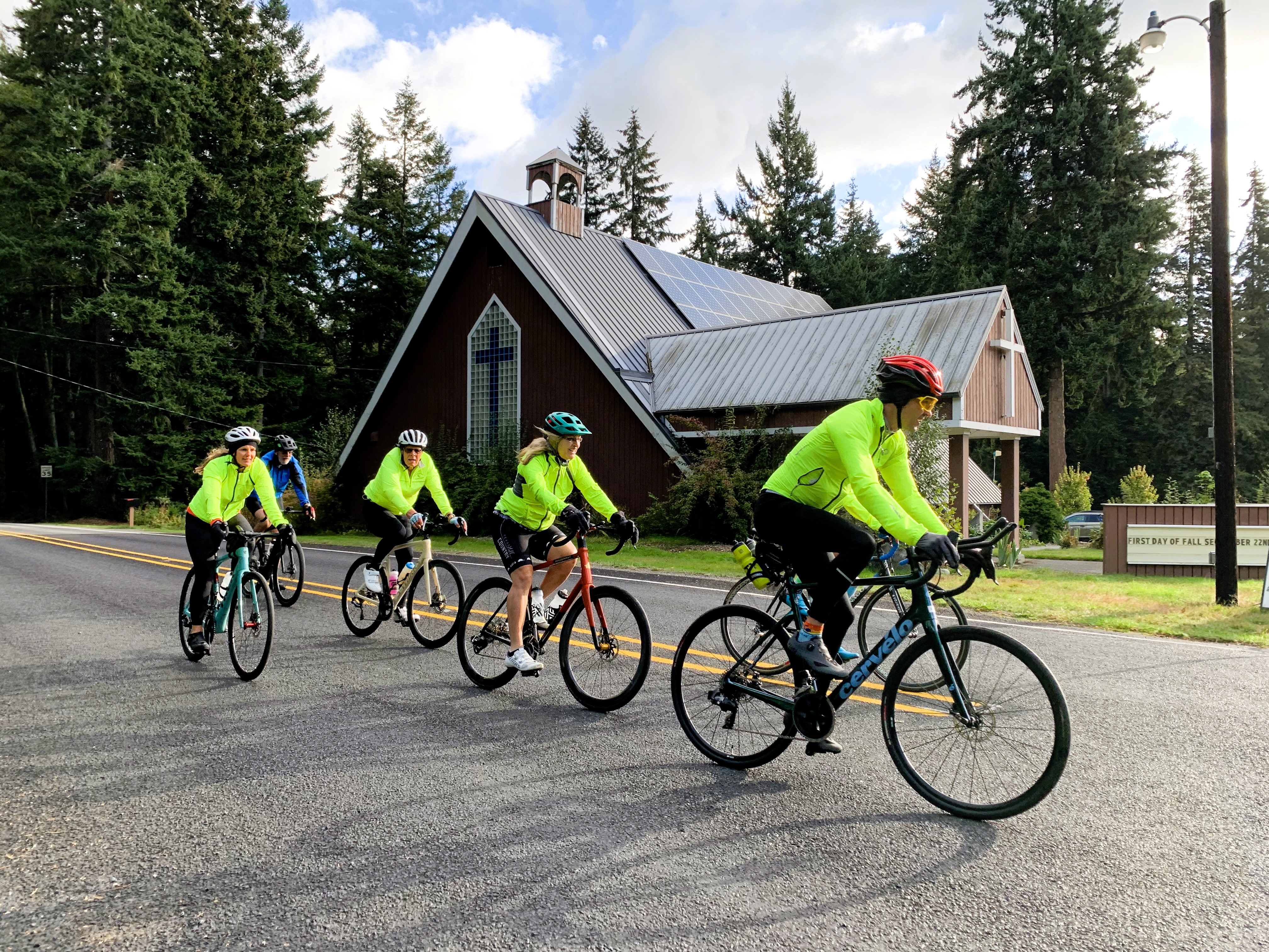 I met up with a group of about a dozen locals including Johnson, BikeWhidbey co-founder Nancy Ritzenthaler, and Cascade supporter Ron Sher for their regularly scheduled weekend ride, which starts in front of the Taproom@Bayview Corner, located near Bayview Bicycles.