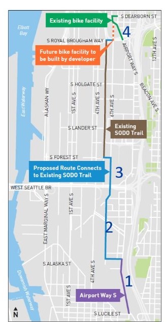 1,700 cones (shown above) installed by SDOT created temporary bike lanes along 1st Avenue South in January, improving bike travel through SODO for a short time. A map of the proposed bike lane (shown below) connecting Downtown to Georgetown along 6th Avenue South.